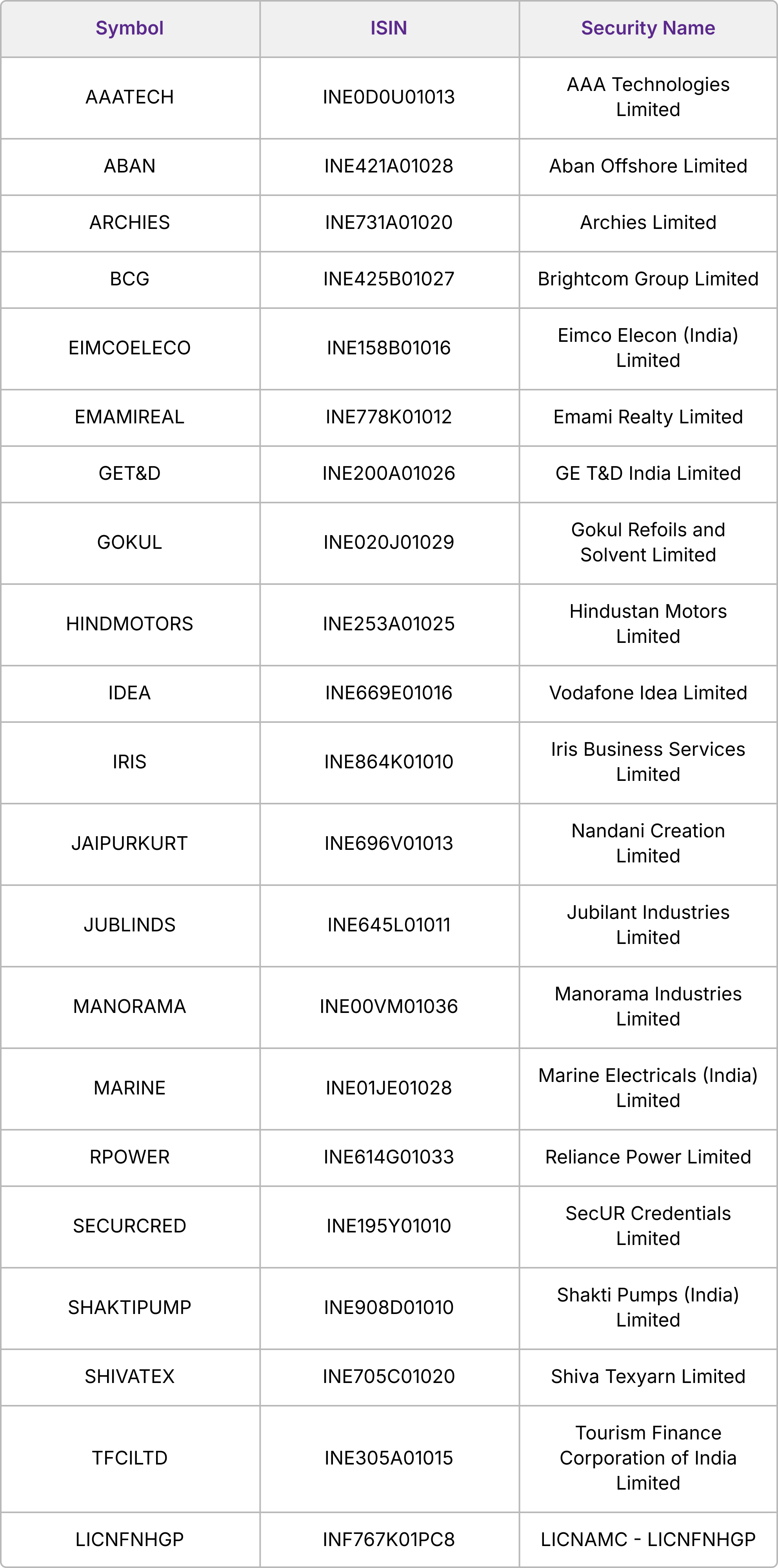 Please note that the following securities will be removed from the Exchange’s 'Approved Securities for Margin Pledge' list. As a result, you will not receive margins for F&O trading against these scrips starting Wednesday, June 26, 2024: