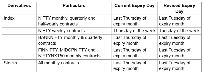 As per NSE’s latest circular, the expiry day for the following indices and stock derivatives has been revised: