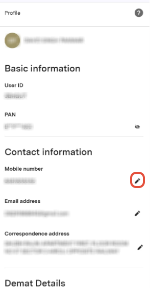 Step 6: Within the contact information section, verify the registered mobile number and click on the edit icon.