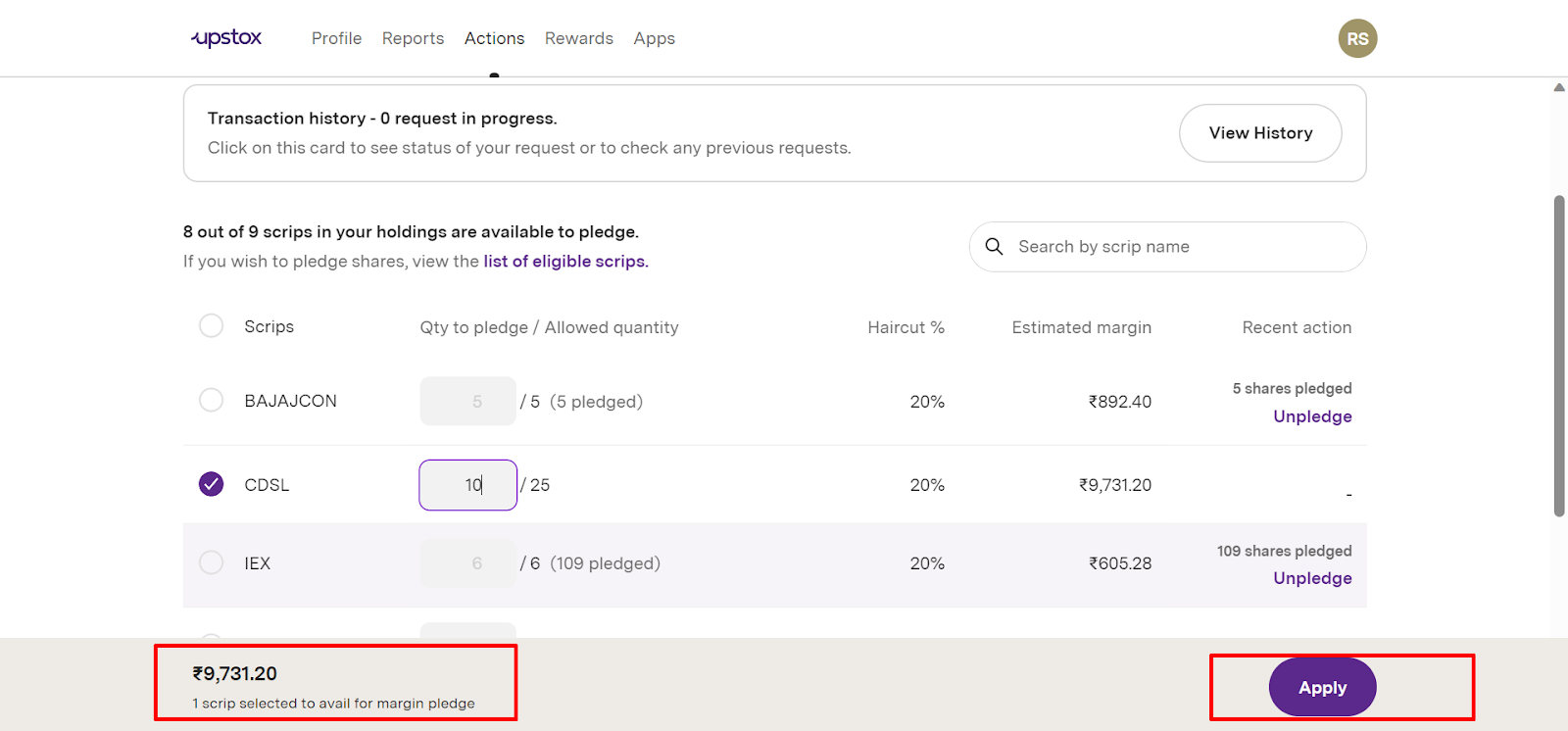 Step 6: Check the pledge details and click on ‘Apply.
