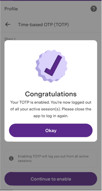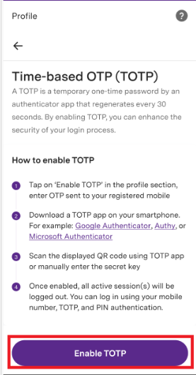 A TOTP is a temporary one-time password by an authenticator app that regenerates every 30 seconds. By enabling TOTP you can enhance the security of your login process.