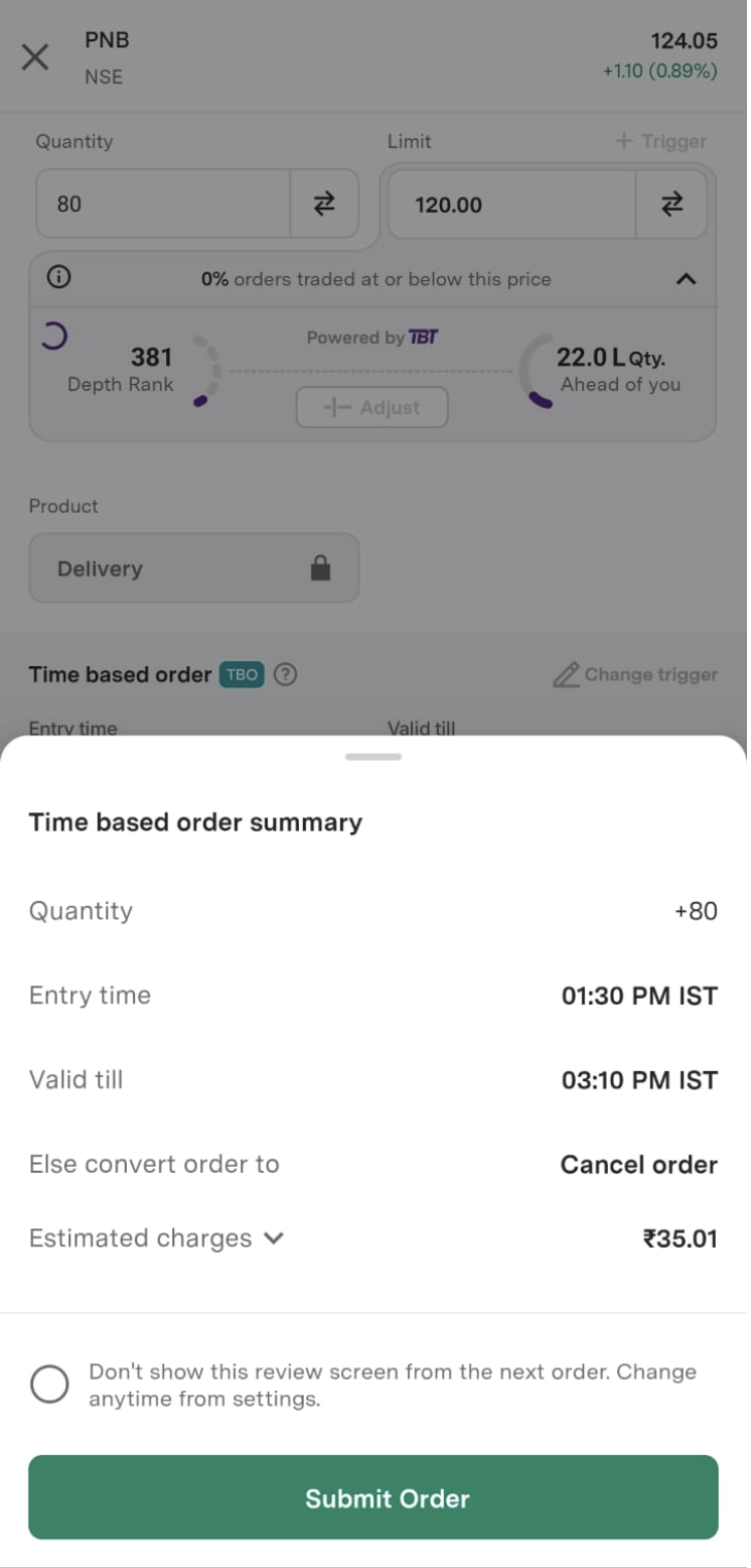 Step 6: On the Time-Based Order Summary screen, tap Submit Order to confirm and place the modified order.