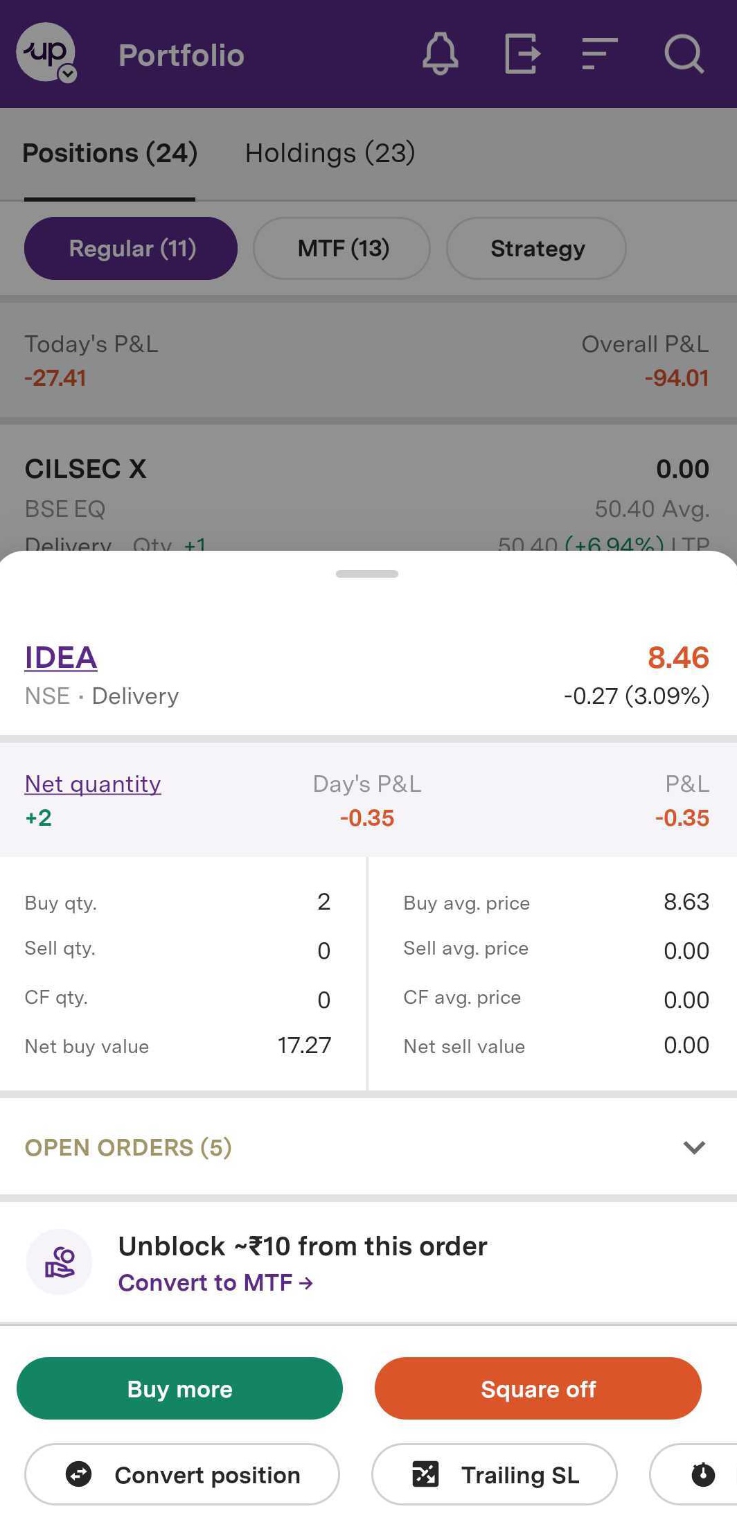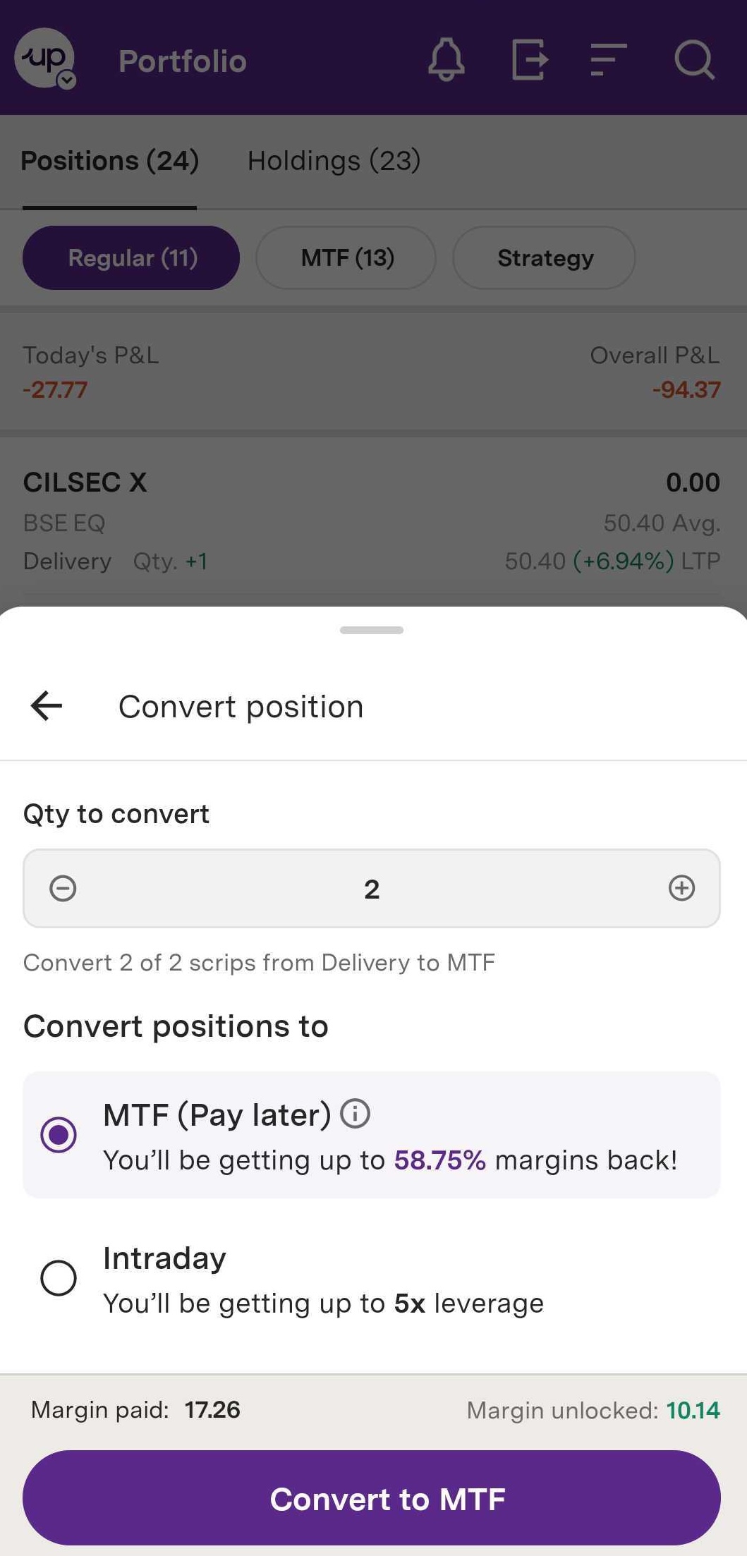 Step 4: You can also convert your delivery positions to MTF or Intraday.