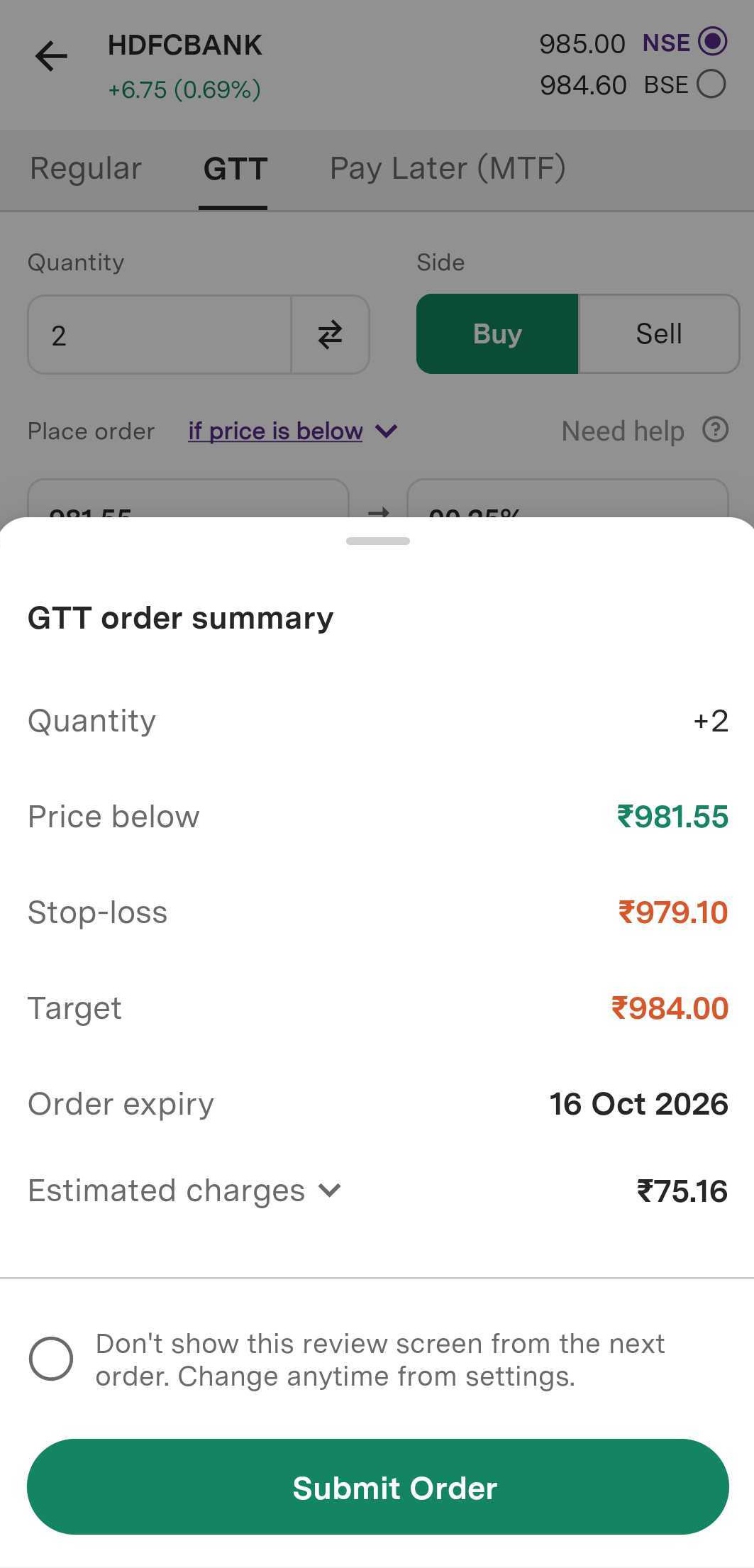 Step 10: Click on ‘Submit order’ and your GTT Order will be successfully placed.
