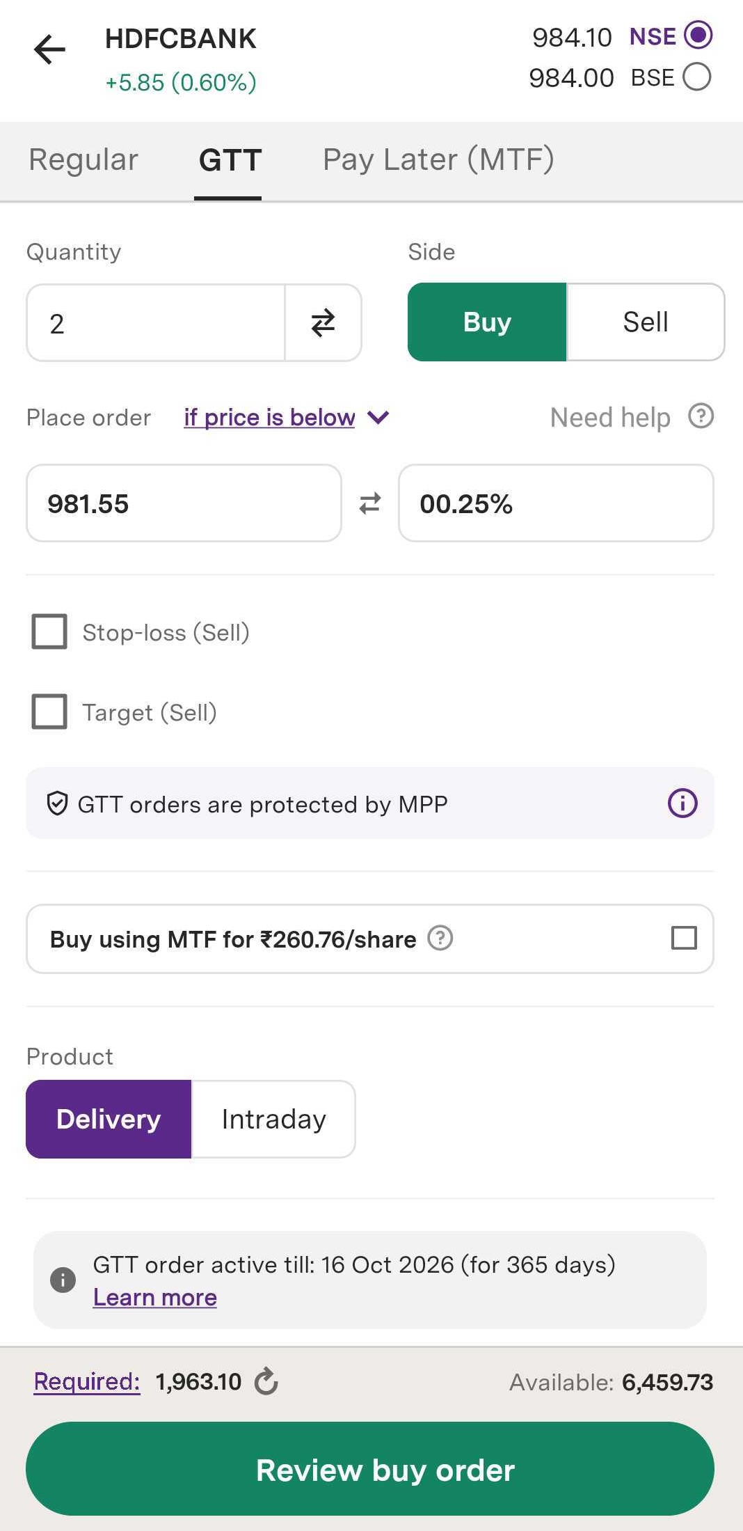 Step 7: Click on ‘Review buy order’, your GTT Order will be successfully placed.