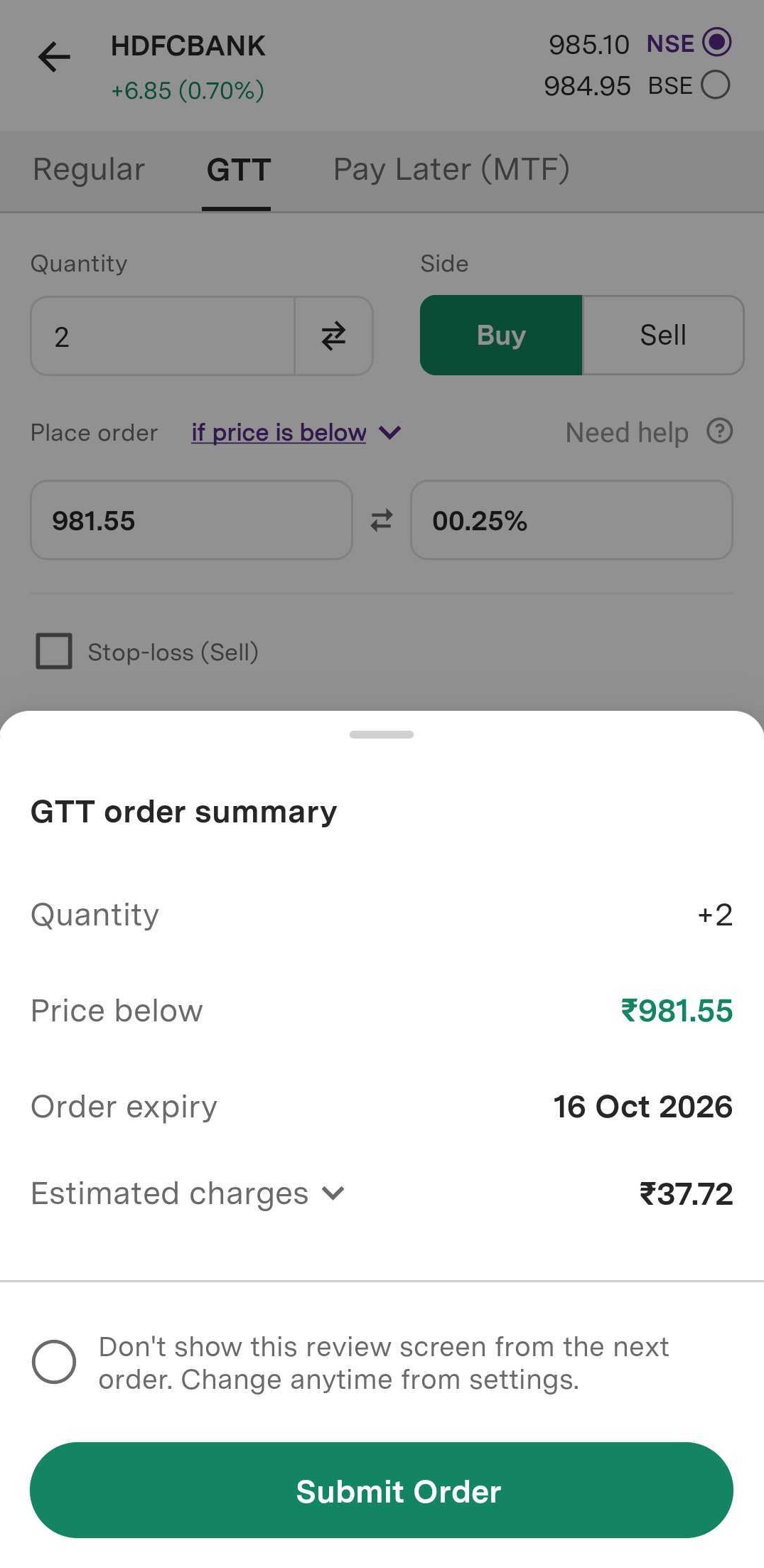 Step 8: Click on ‘Submit order’, your GTT Order will be successfully placed.
