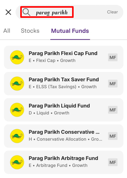 Once you click on the search icon on the homepage of Mutual funds, type your desired mutual fund to invest as shown below.