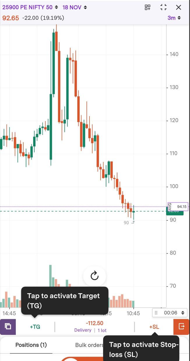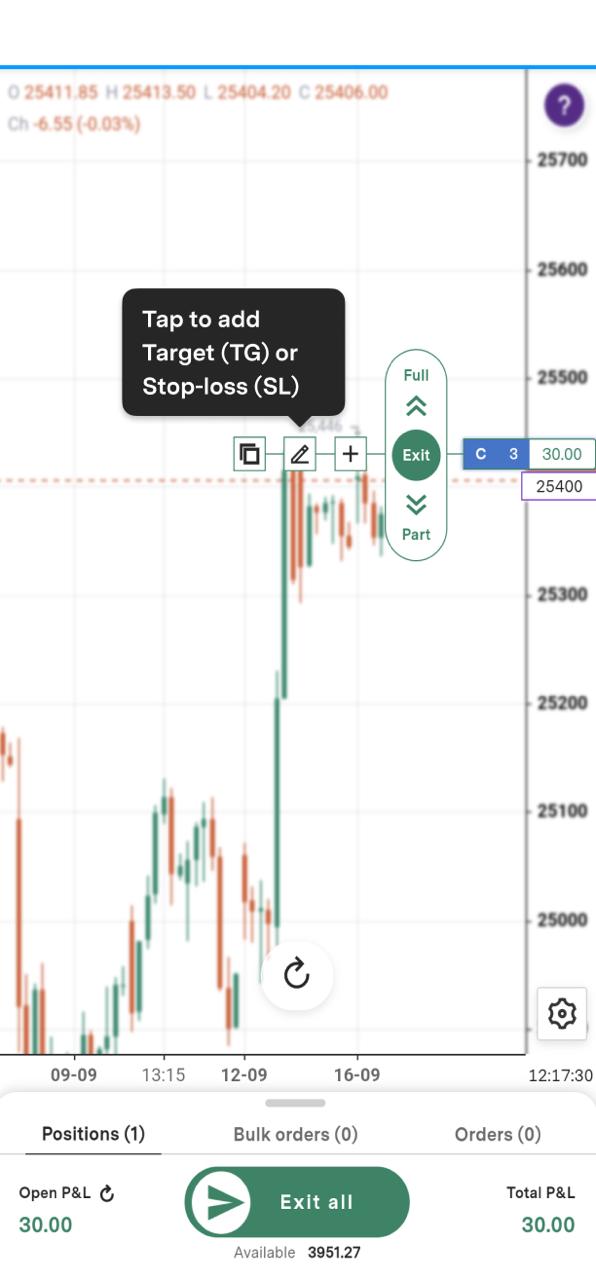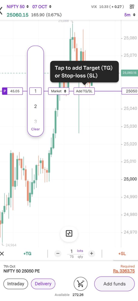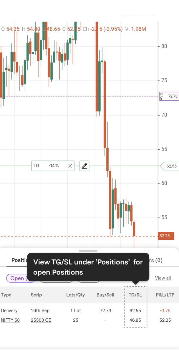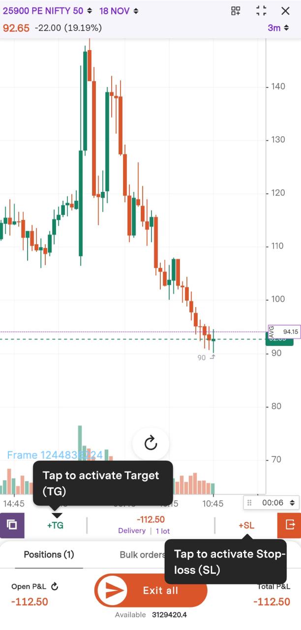 Step 4: Tap to activate Stop-loss (SL) /Target (TG), or Drag the lines to set the desired target and stop loss levels, or tap the keyboard icon to manually enter the values.