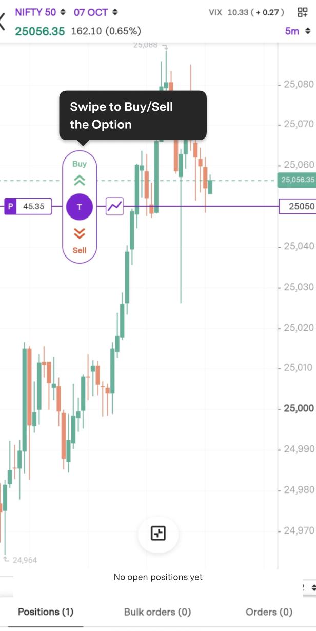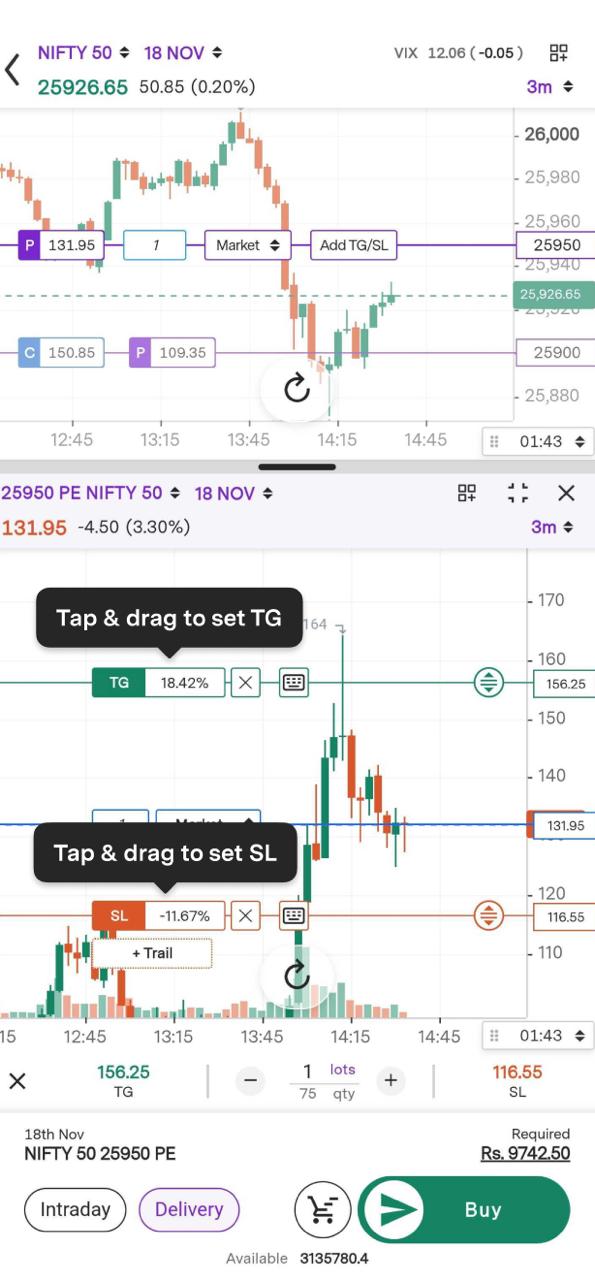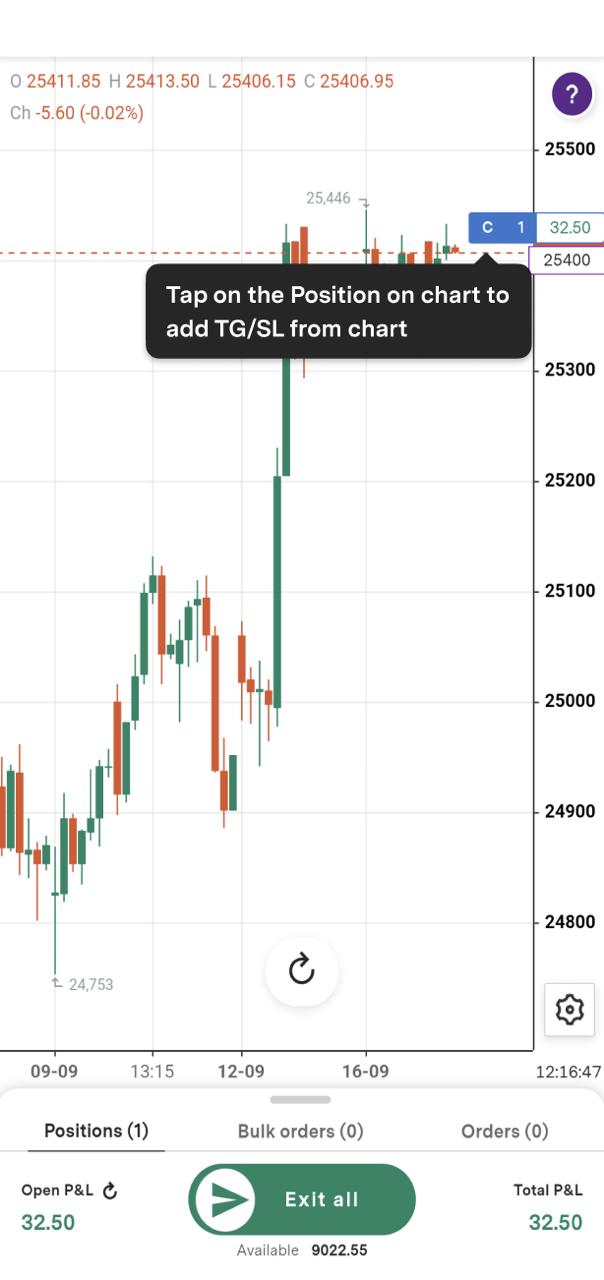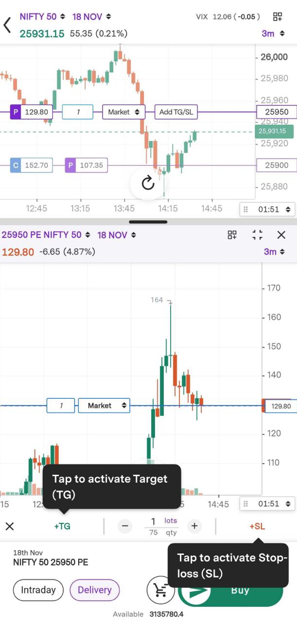 Step 4: Tap to activate Stop-loss (SL) /Target (TG), or Drag the lines to set the desired target and stop loss levels, or tap the keyboard icon to manually enter the values.