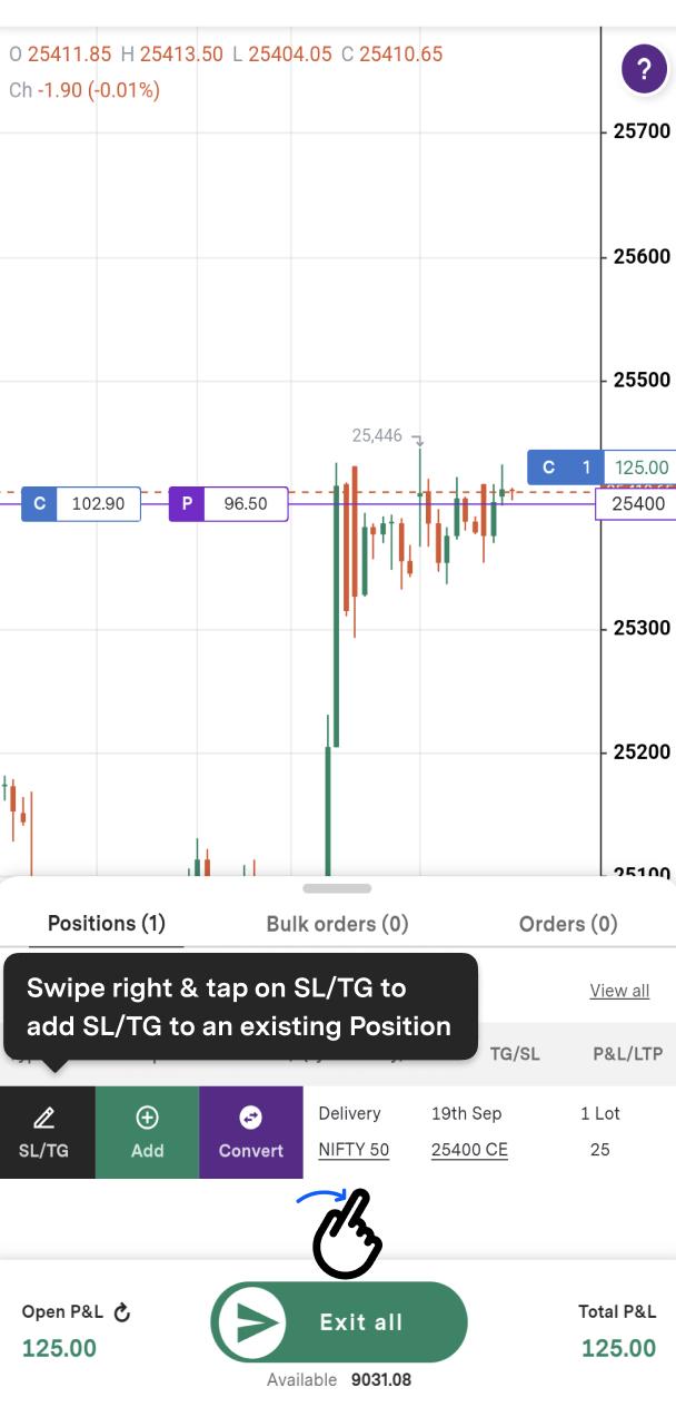 Step 1: Right-swipe the open position and click on the edit icon to set stop-loss and target.