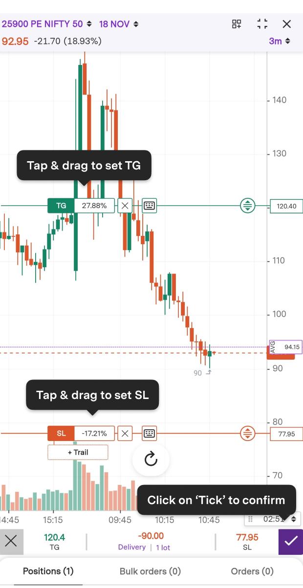 Step 3: Tap and drag the stop-loss/target line at desired price and click on Tick to confirm.