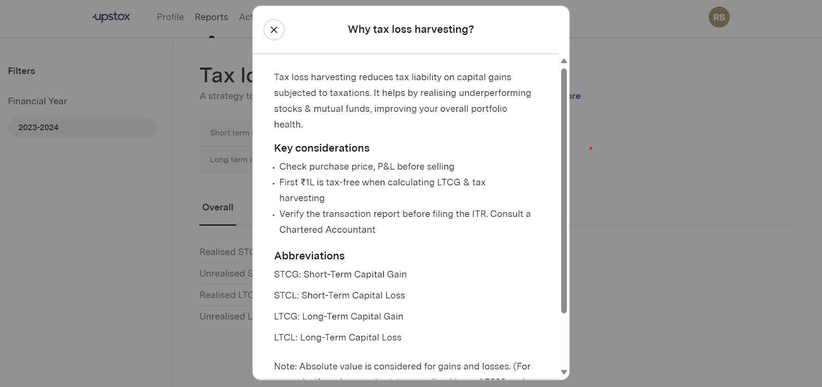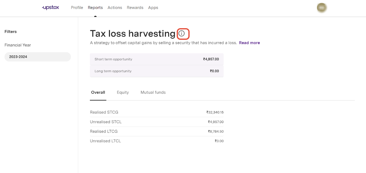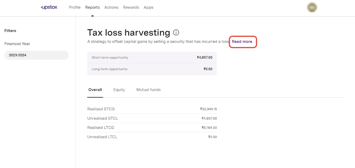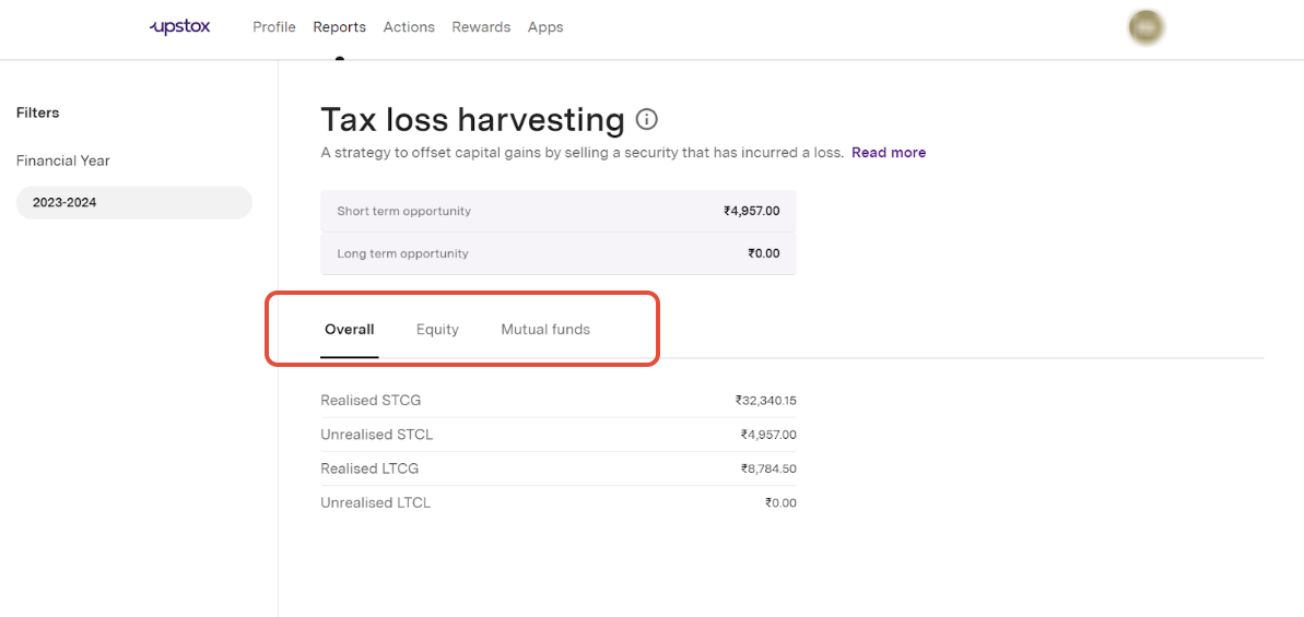 Step 4: Choose the provided options—overall, equity, and mutual funds—to gain a thorough understanding of gains and losses within their respective segments. This will help you understand your short term and long term tax-loss harvesting opportunities.