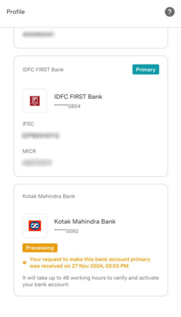 Note: Please be aware that it might take up to 48 working hours to verify and activate your newly added bank account. A charge of ₹50 + GST will be debited from your trading account for any changes made to your bank account.