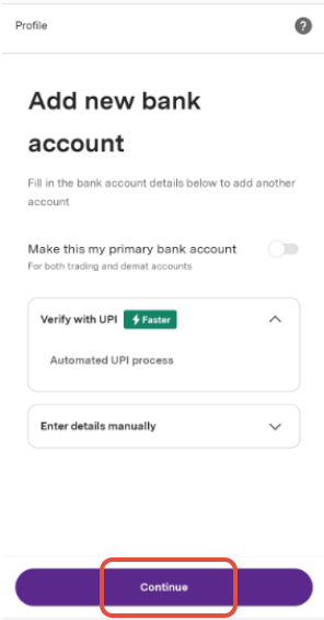 Note: Please be aware that it might take up to 48 working hours to verify and activate your newly added bank account. A charge of ₹50 + GST will be debited from your trading account for any changes made to your bank account.
