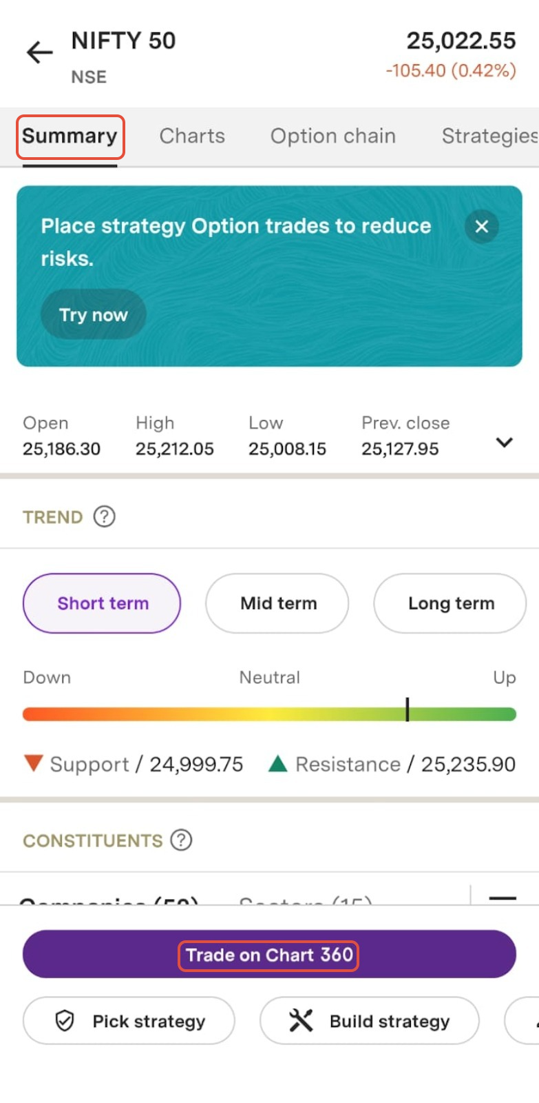 2. From the Indices Summary Page: Select any index from your Watchlist. On the summary page, tap Trade on Chart 360.