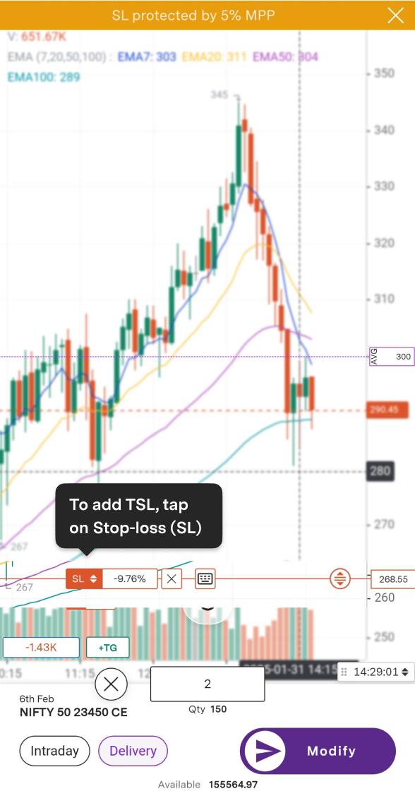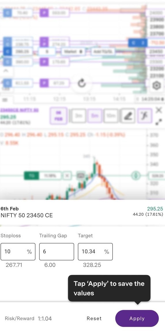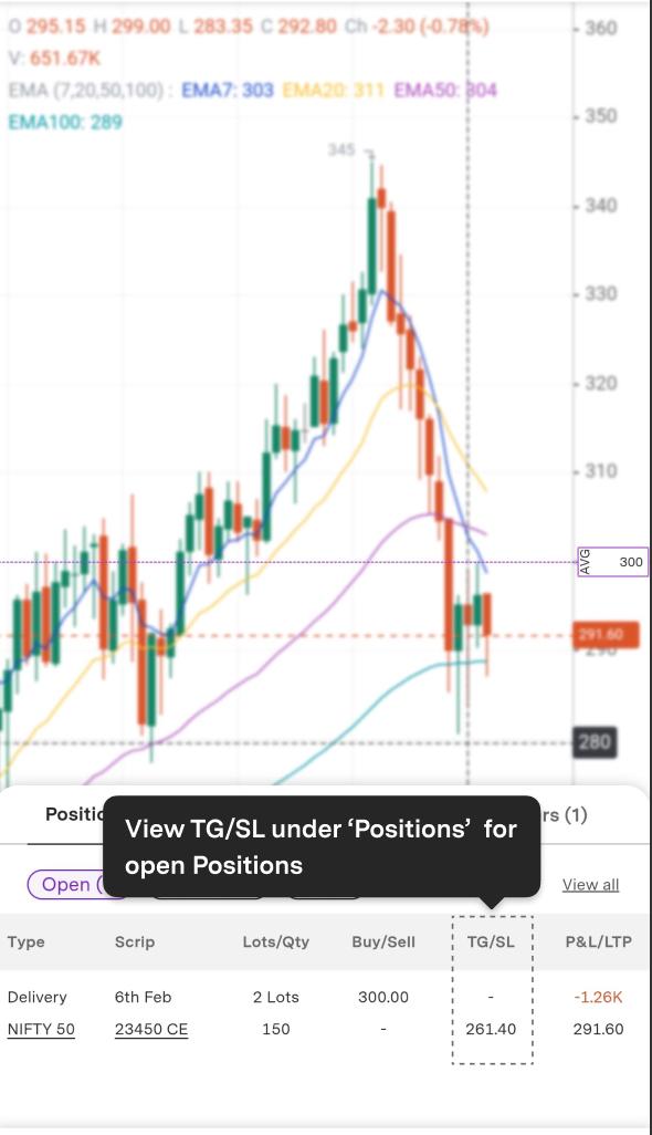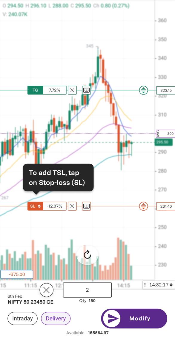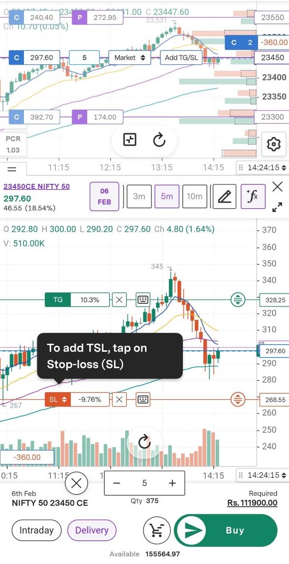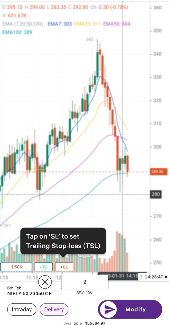 To set a TSL on Chart 360, select the Call/Put Option you want to trade in. Click on ‘Add TG/SL’ and locate the ‘SL’ button. Tap on it to convert it into ‘TSL’.