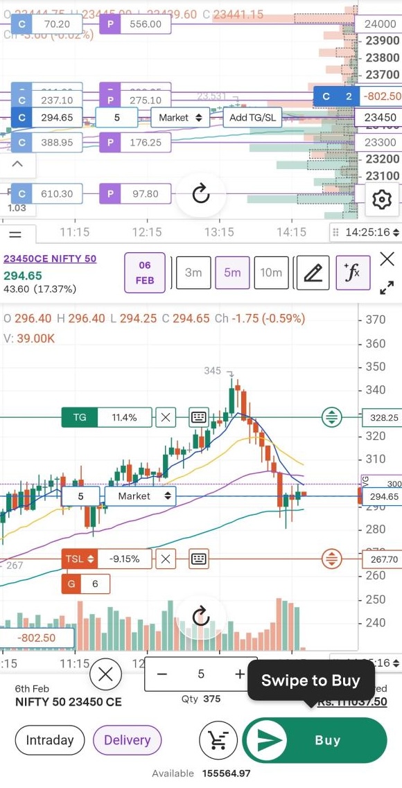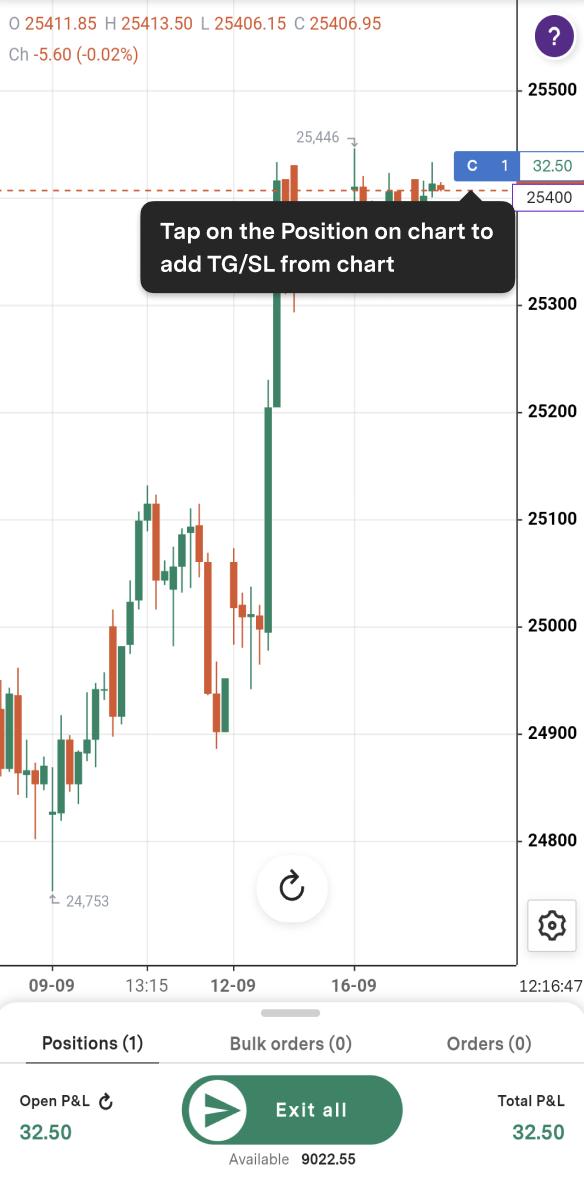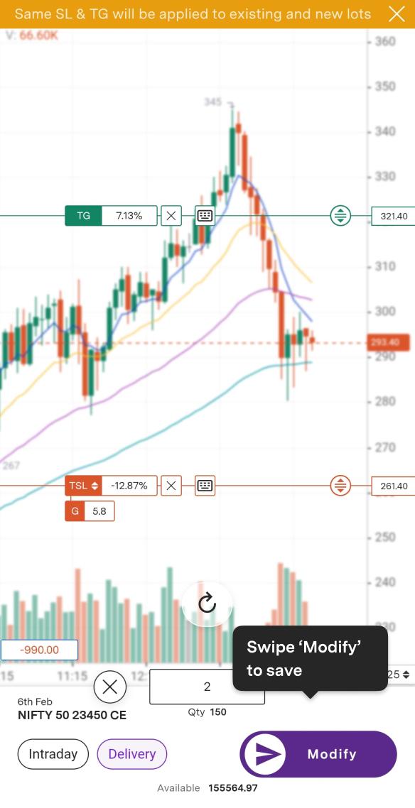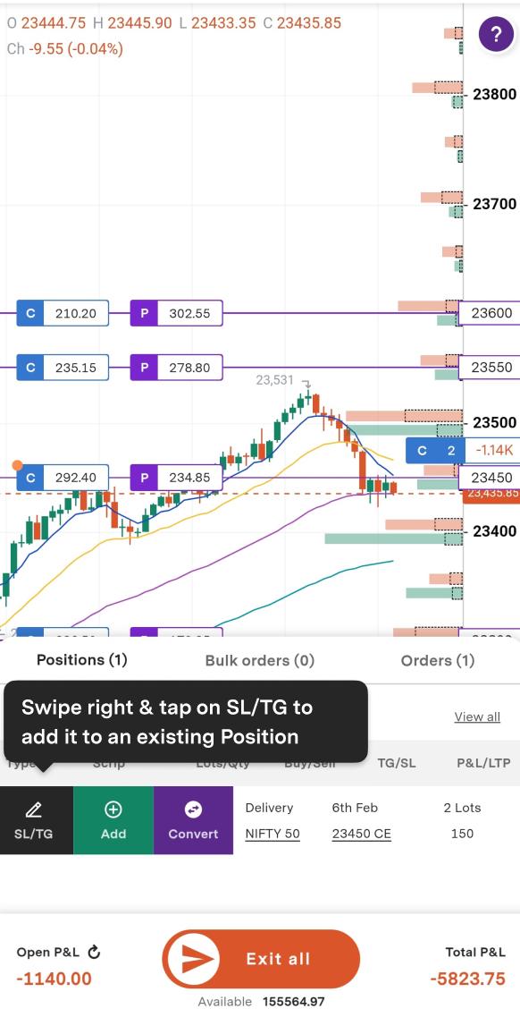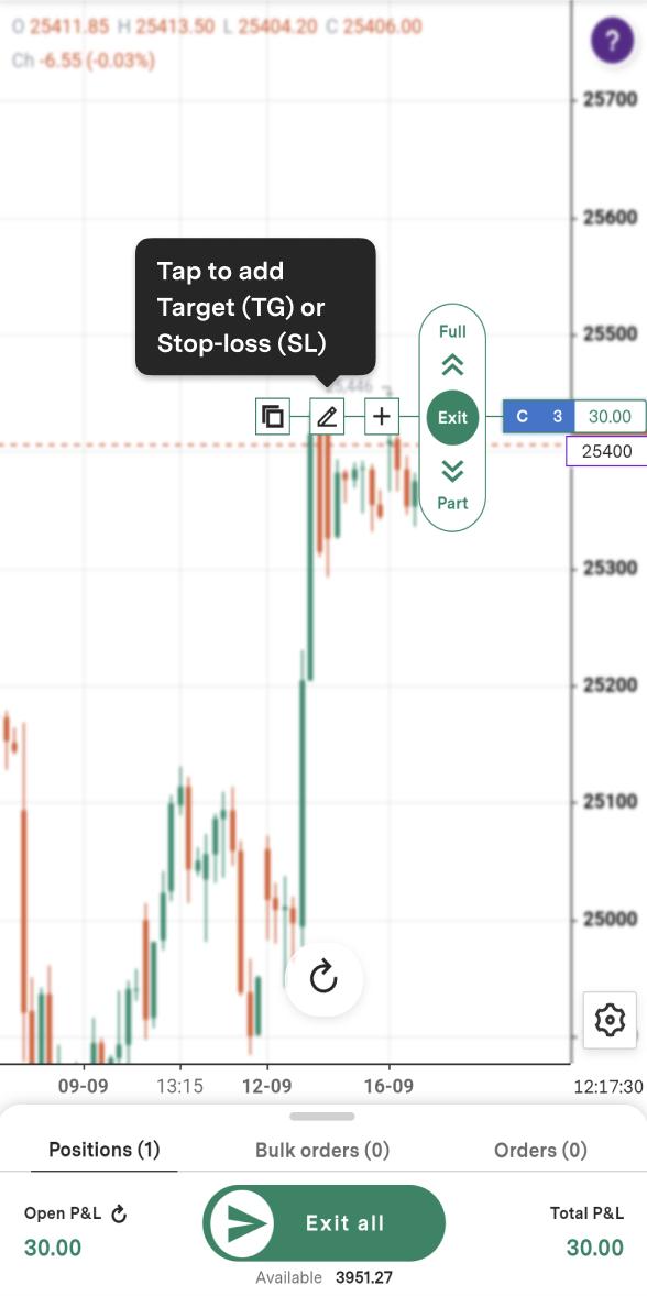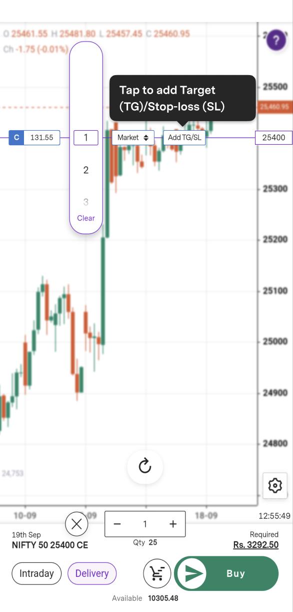 To set a TSL on Chart 360, select the Call/Put Option you want to trade in. Click on ‘Add TG/SL’ and locate the ‘SL’ button. Tap on it to convert it into ‘TSL’.