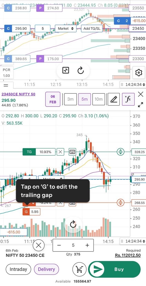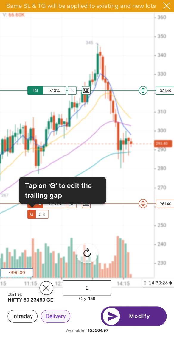 You will see an additional ‘G’ button, representing the trailing gap. Tap on it and enter your desired trailing gap value. This ensures your stop loss adapts to market movements, helping you lock in profits while minimising the risk.