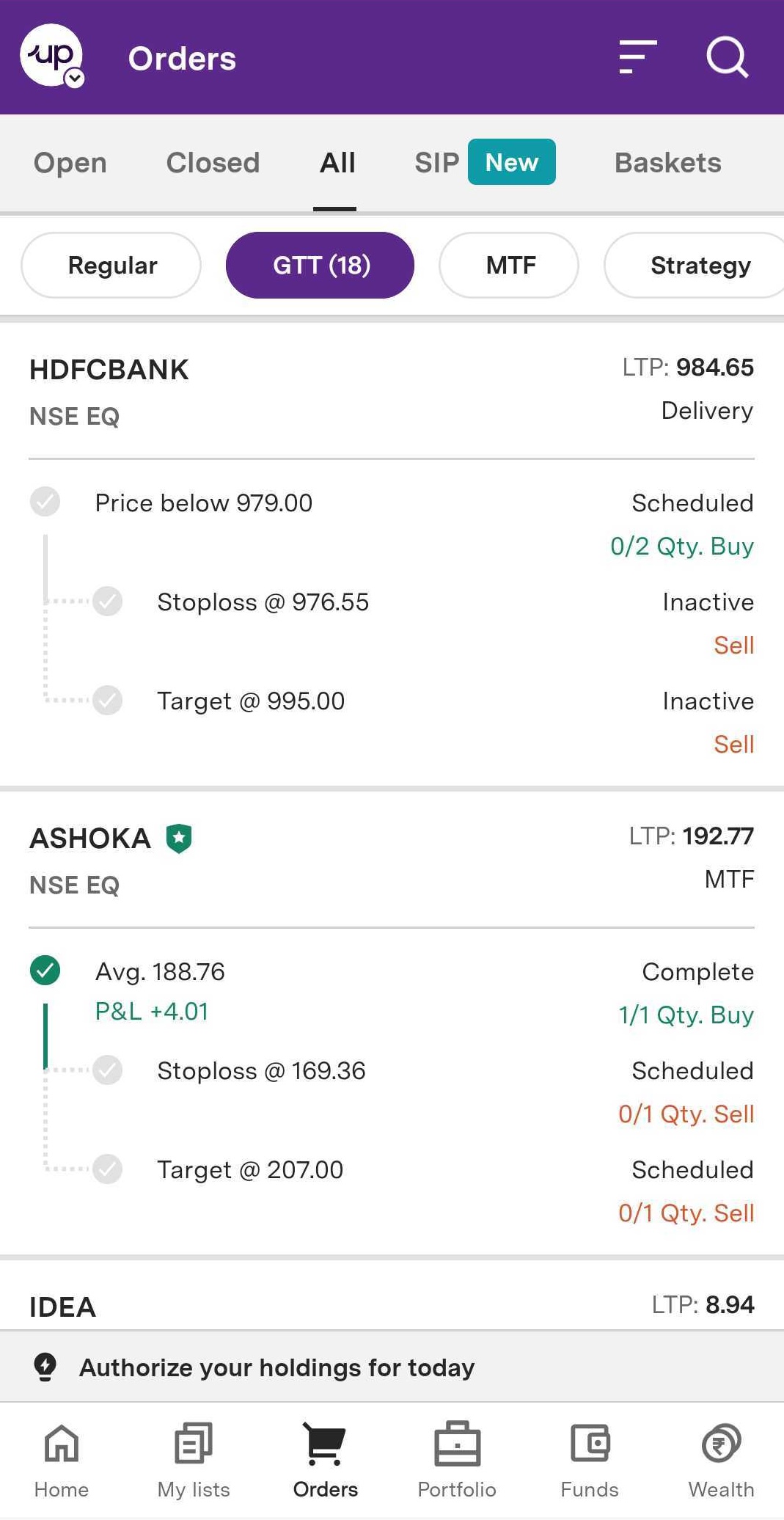 Step 5: You will see Regular, GTT, MTF, and Strategy toggle on the top. Click on ‘GTT’ to see your GTT orders.