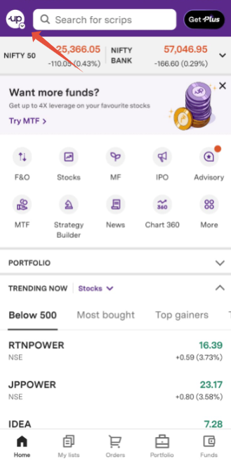 Step 2: Click on 'Upstox Icon' at the top left corner of the screen.