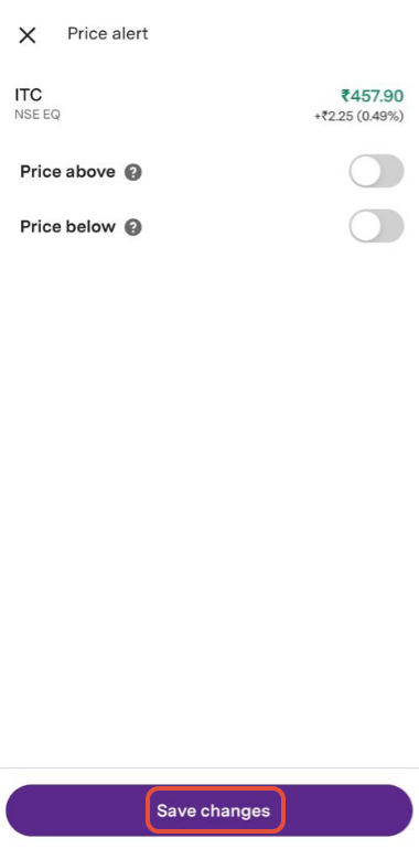 Once you click on the Bell icon, you can set the 'Price Above' and 'Price Below' by enabling the toggle button and clicking on 'Save Changes' to set a price alert.