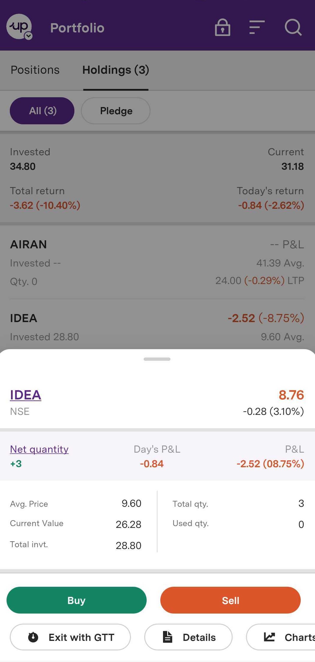 Step 5: It also shows the quantity, avg price and quantity for the selected stock.
