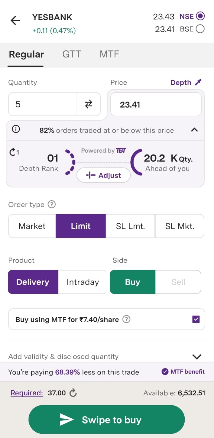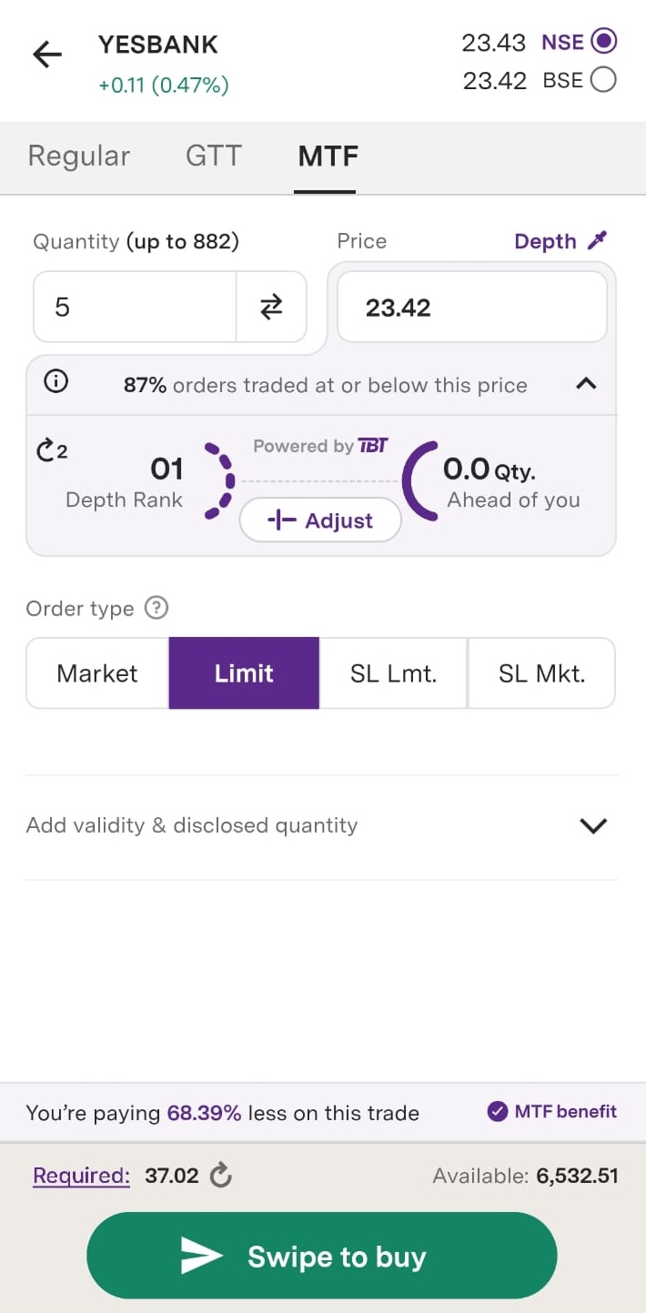 Step 4: You can view the ‘Buy using MTF for XXX/share via MTF’ checkbox under the ‘Regular’ order or you can go to the ‘MTF’ tab, enter the order details, and then Swipe to buy’.