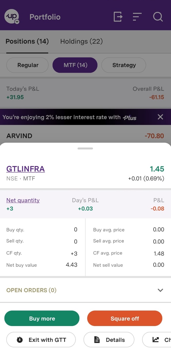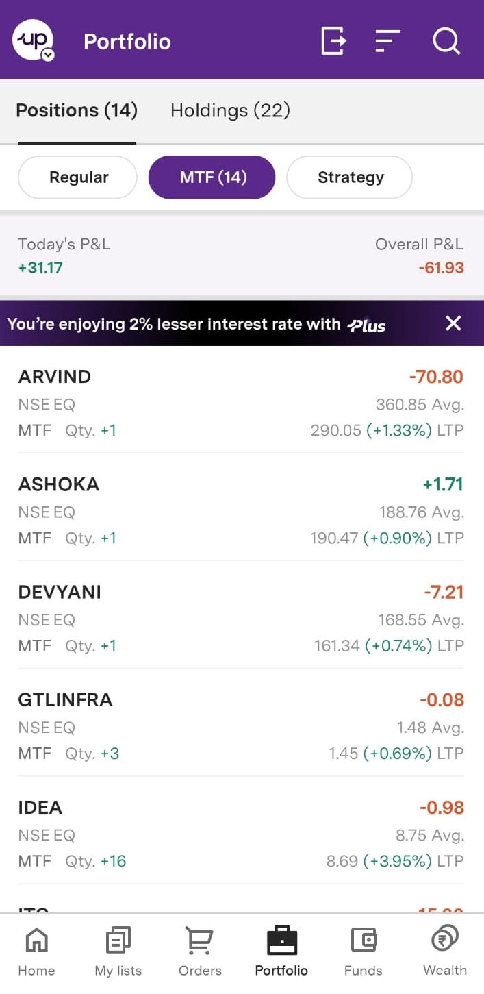 Step 2: Go to MTF positions Access MTF holdings 1. Tap the ‘Portfolio’ tab at the bottom navigation 2. Select ‘Positions’ (not Holdings) 3. Click on ‘MTF’ to view all your margin-funded positions
