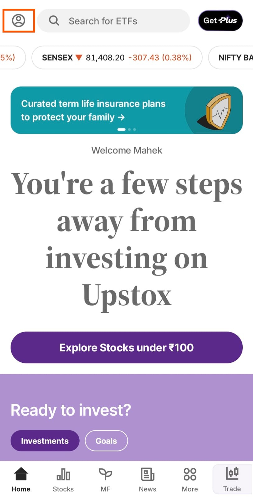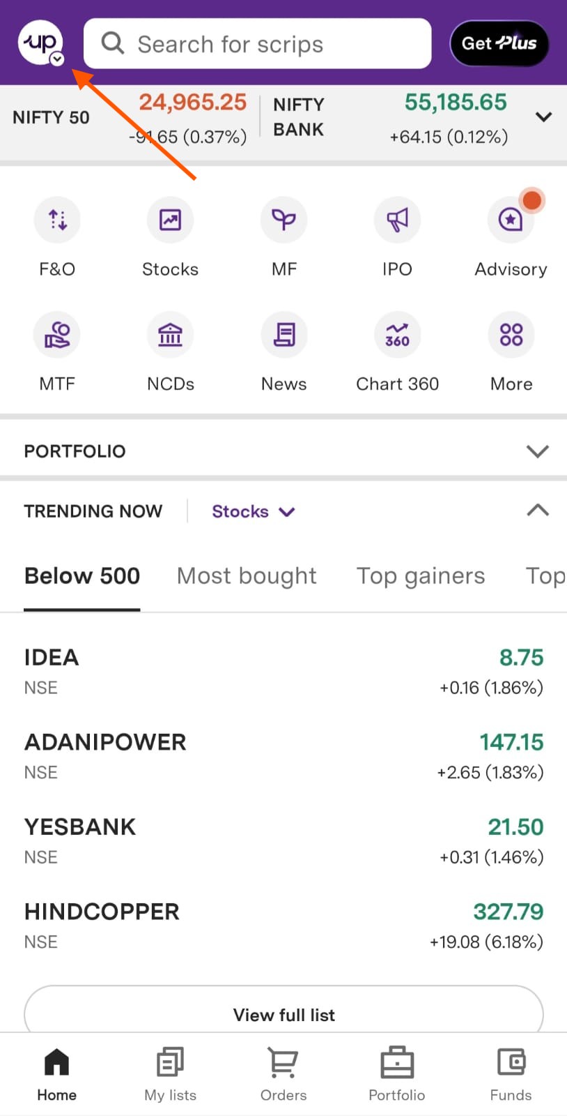 Step 2: Click on the ‘Upstox Icon’ at the top left corner of the screen.