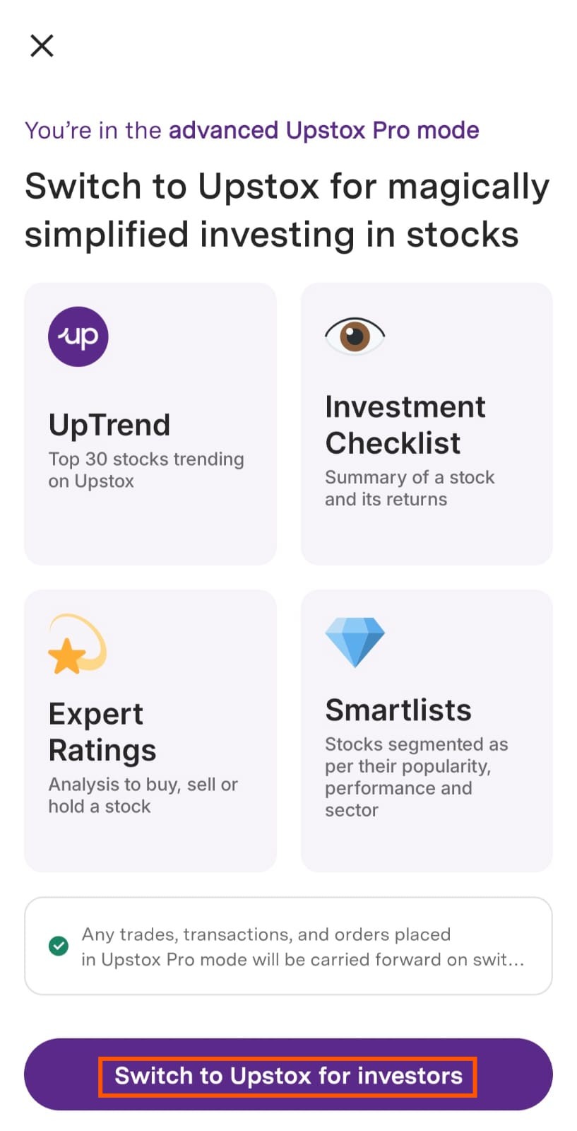 Step 3: You will get the below screen with details, click on “Switch to Upstox pro” on the bottom.
