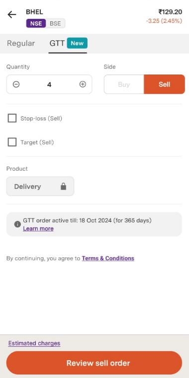 Step 5: Click on GTT and fill in the details on the order entry page, you can now personalise your GTT Orders by choosing either a Stop-Loss, a Target, or both,and click ‘Review Sell Order’.