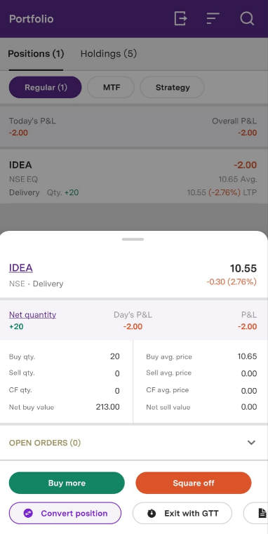 Step 3: Select any stock you want to sell and click ‘Exit with GTT’ or click on ‘Square off’ and Select ‘GTT’.