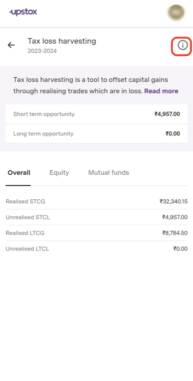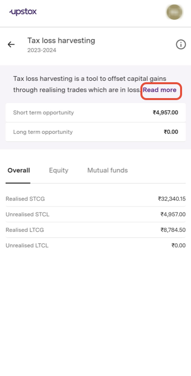 Step 6: Choose the provided options—overall, equity, and mutual funds—to gain a thorough understanding of gains and losses within their respective segments. This will help you understand your short term and long term tax-loss harvesting opportunities