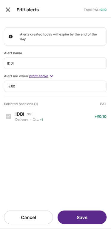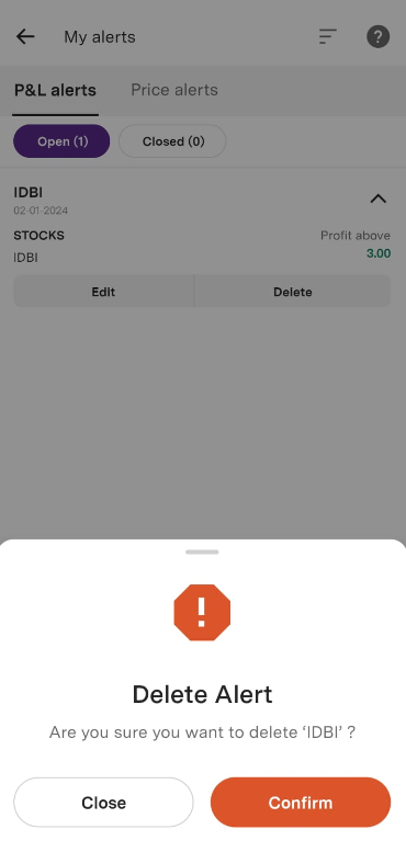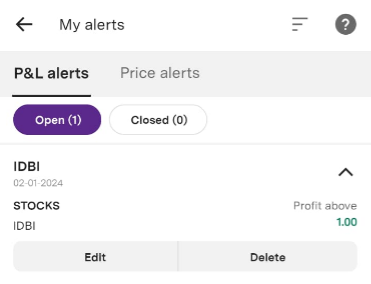 Step 2: Click the bell icon on the position whose P&L alert you wish to delete and then click on the ‘Delete’ option
