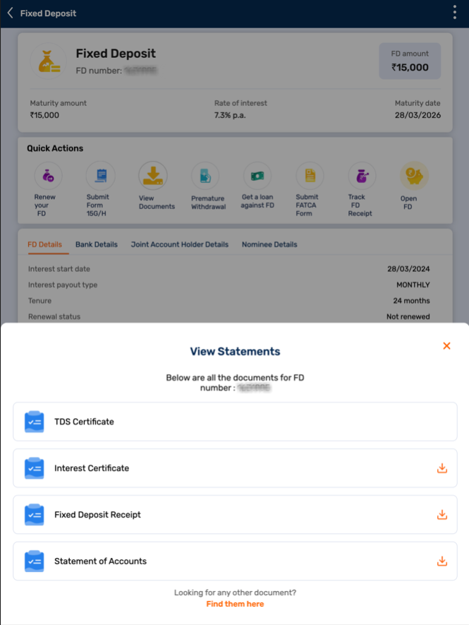 Step 2: Here, you can find and download your FD receipt, TDS certificate, Interest certificate, Statement of Accounts etc.