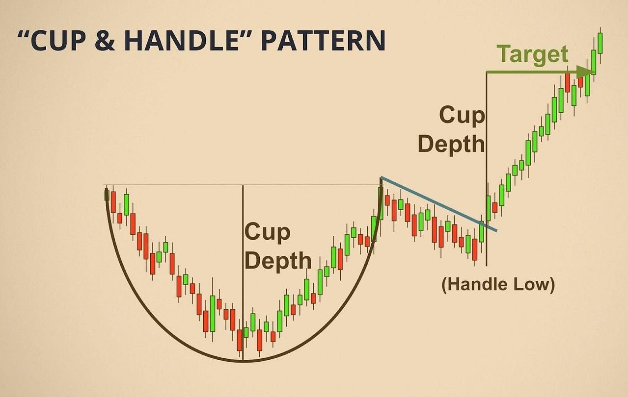 The cup in this pattern takes a few weeks to a few months to form. The handle is usually formed in one to four weeks. In simple words, the cup forms gradually as the market regains confidence and the handle is a brief pause before the breakout.