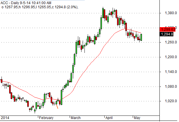 The Associated Cement company has put up an interesting situation (chart below). The stock is near a previous breakout point of late March 2014. It has also shown some buying interest by the way of three failed attempts to break down below the 1260 area. You will notice that as ACC approached this area it faces buying pressure, this can be seen with the formation of lower wicks.