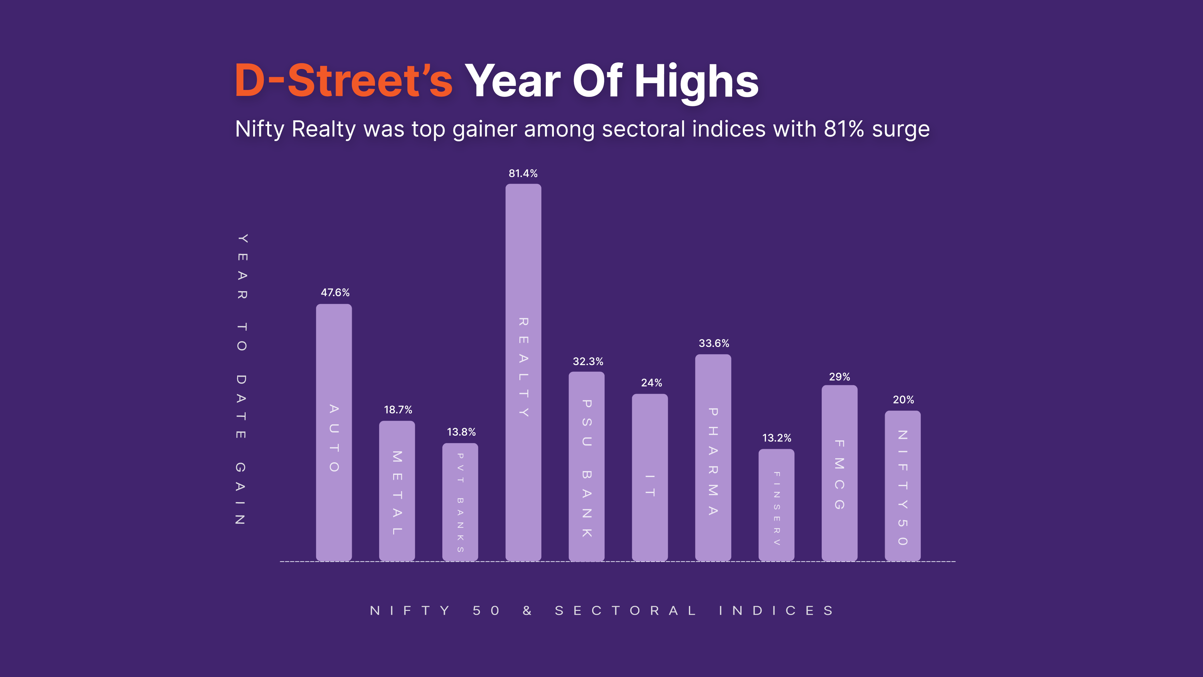 On the morning of December 28, bullish sentiment dominated the market, propelling the benchmark BSE SENSEX and NIFTY 50 to unprecedented heights of 72,281.63 and 21,728.3, respectively. The Realty index was the top gainer among sectoral indices on a year-to-date basis.