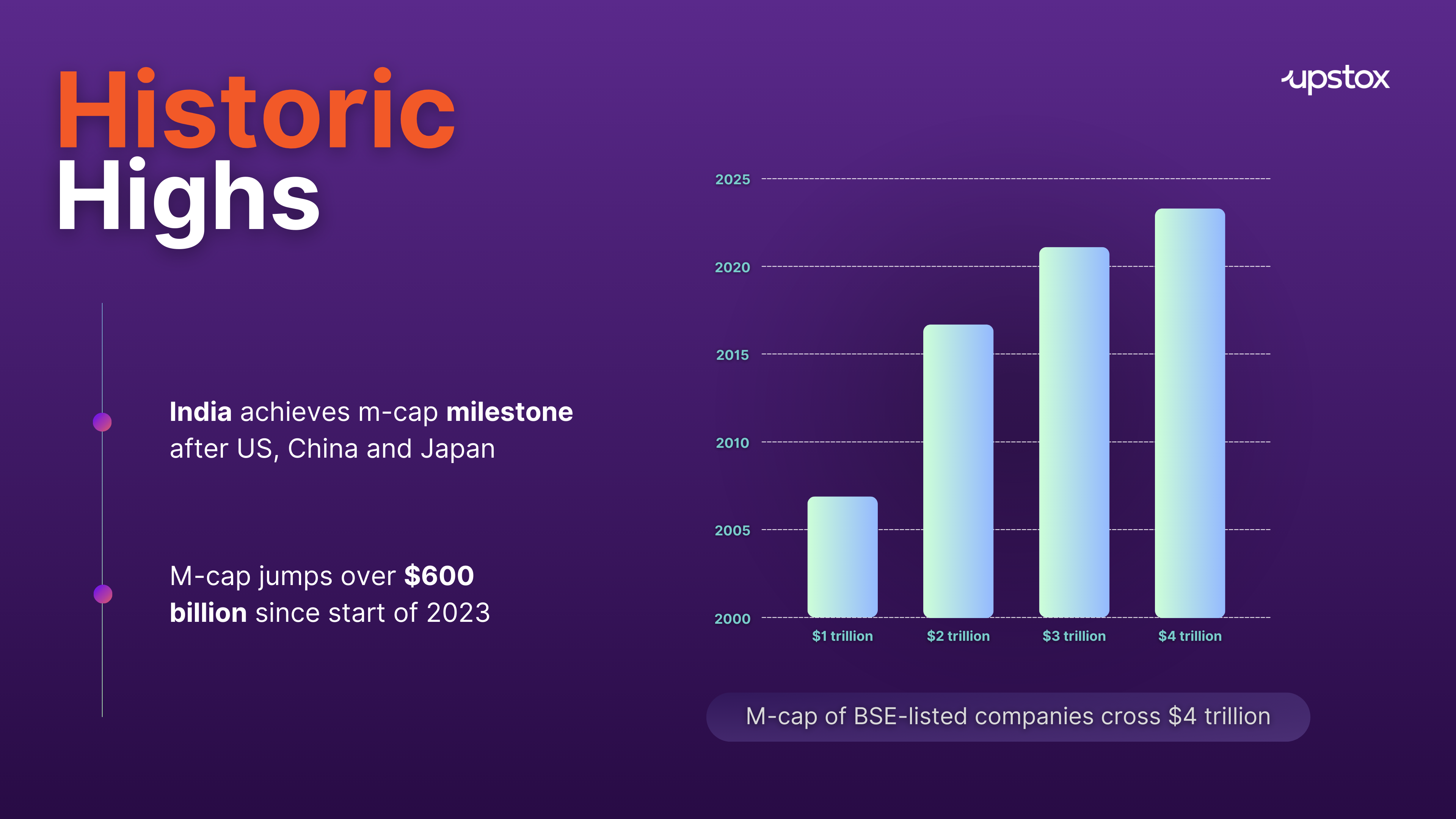 The week also saw a remarkable feat by the Indian stocks with the combined market capitalisation of BSE-listed companies surpassing $4 trillion for the first time ever.