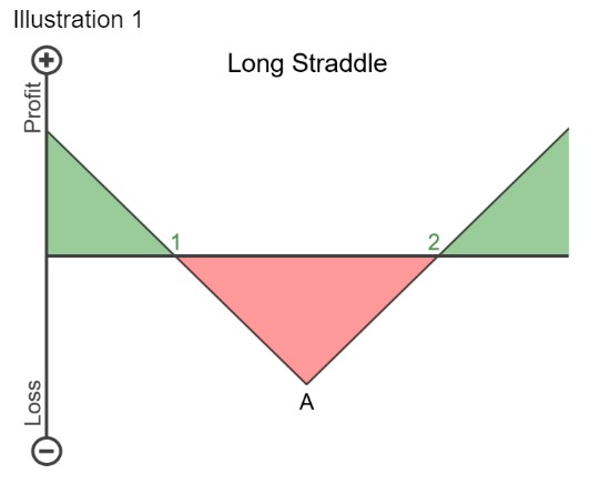 If an options trader is uncertain of the direction of the market or individual stock, they can place a ‘non-directional strategy’ like a straddle. A straddle is the simultaneous purchase of a call and put option with the same strike price and expiration date. A straddle is profitable for a trader if the underlying’s price moves significantly rather than staying flat. The more the underlying’s price moves, the greater the profit. A straddle is a debit strategy; a trader has to pay upfront to enter into the position. The drawback to this strategy is that you are buying both a call and a put so you are paying two premiums. In the diagram below, we plot the payoff diagram of a long straddle. This diagram shows a straddle centered on the strike price of ‘A’. The break-even points are above and below and denoted as ‘1’ and ‘2’. The first break-even point is the cost of the straddle minus the strike price. The second break-even point is the cost of the straddle plus the strike price.