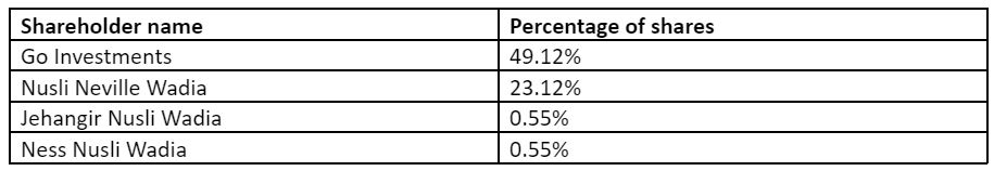 It is the aviation foray of India’s Wadia Group, which is a part of one of the oldest conglomerates in India with a presence in diversified industries. The Wadia group comprises leading brands including 150-year-old The Bombay Burmah Trading Corporation Limited, 140-year-old Bombay Dyeing and Manufacturing Company Limited, 102-year-old Britannia Limited, 66-year-old National Peroxide Limited, the decade-old Wadia Reality Private Limited and many others.