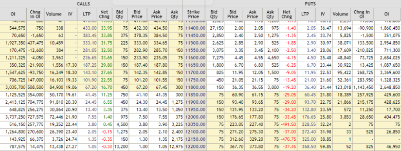 The above is an option chain wherein for all the strikes, the call and put data are juxtaposed to each other. In one glance, you get all the information about each strike. Typically, an option chain trading strategy is formulated by seeing accumulations in Open Interest (OI) and volumes in various option strikes. Let us look at how to interpret the above option chain on the Nifty and create actionable trading calls on the same. Here is how to interpret Nifty option chain: