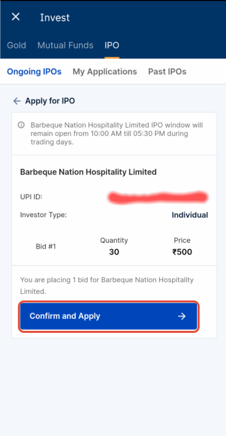 - Review the IPO application once again with all the details and click ‘Confirm and apply’.
