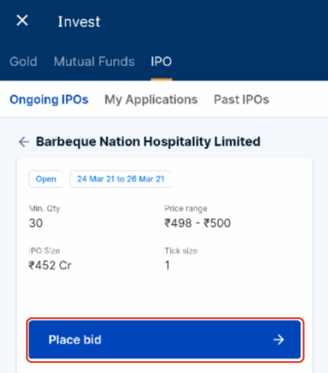 - Go to the 'Invest' tab from the bottom navigation bar and click on the ‘View ongoing IPOs’ from the IPO section.