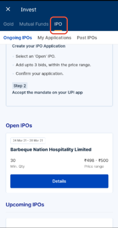 - Using Upstox App, click on the IPO section of the Invest tab.