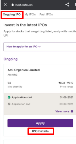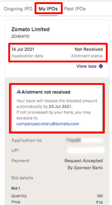 - Ongoing IPOs, My IPOs, and Past IPOs. So click on the ‘My IPOs’ tab here you will see your allotment status i.e. received or not received. Here you can click on view more and see details about the IPO.