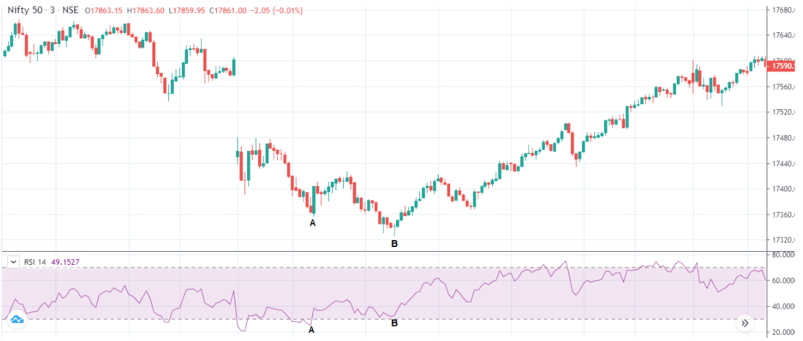 Now, look at the corresponding A & B points on the RSI chart. Those are two swing low points on the RSI chart. Here, when we connect point A & B, we would see the RSI is making higher lows (B point is higher than the A point)