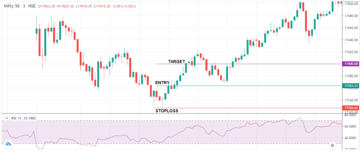 Since it’s an intraday and a quick trade, the timeframe being 3 minutes, we will aim for a risk to reward of 1:1. In our example, the risk being 37 points, we will aim for a target of 37 points too from our entry price which comes to 17400 (17363+ 37)