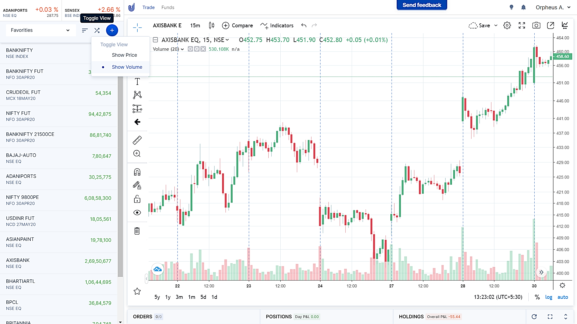 We’ve given your analysis an extra boost by providing toggle view in your watchlists. Pro Web 3.0 gives you the option to view volume instead of price in your watchlist. You switch between volume and price, simply by clicking on the toggle button (as shown below).
