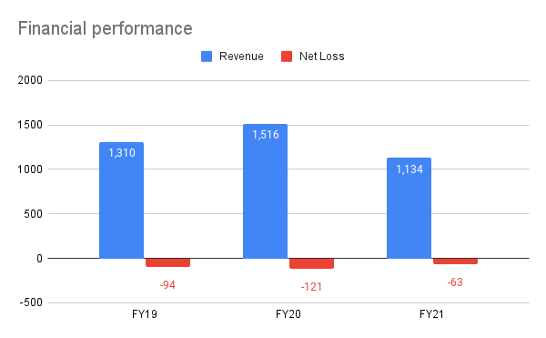 In FY21, its revenue shrunk by 25% to ₹1,134 crore. However, the company’s losses nearly halved to ₹62 crore in FY21 from ₹121 crore in FY20.